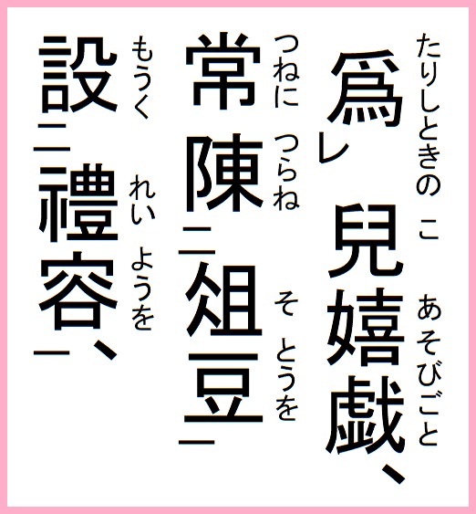 児たりし時の嬉戯、常に俎豆を陳ね礼容を設く、