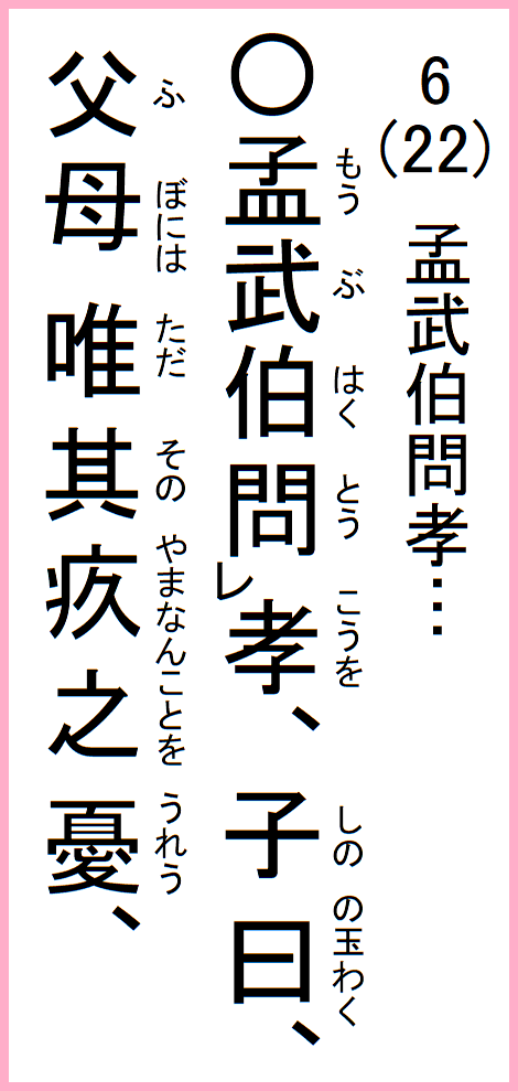 孟武伯が孝について質問した。先生が仰った。父母は子供の病気を何よりも心配する。だから子供としては健康でいることが何よりの孝である。