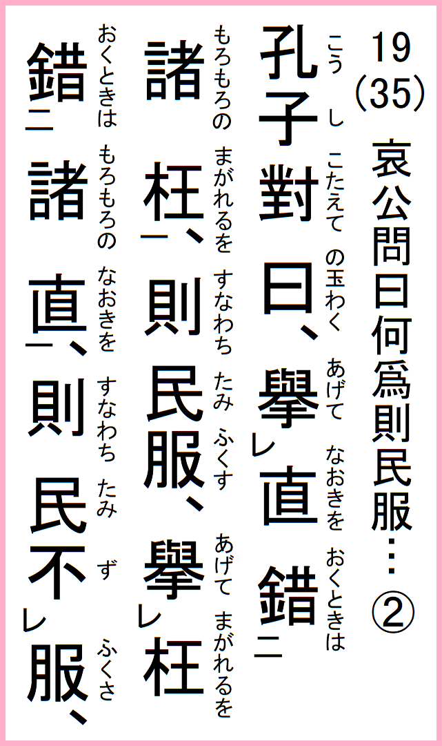 孔子が答えて仰った。真面目な人を挙げ用いて、諸々の不真面目な人を捨て錯けば、民は政府を信用して順い服す。逆に不真面目な人を挙げ用いて、諸々の真面目な人を捨て錯けば、民は政府を信用せず服さない。