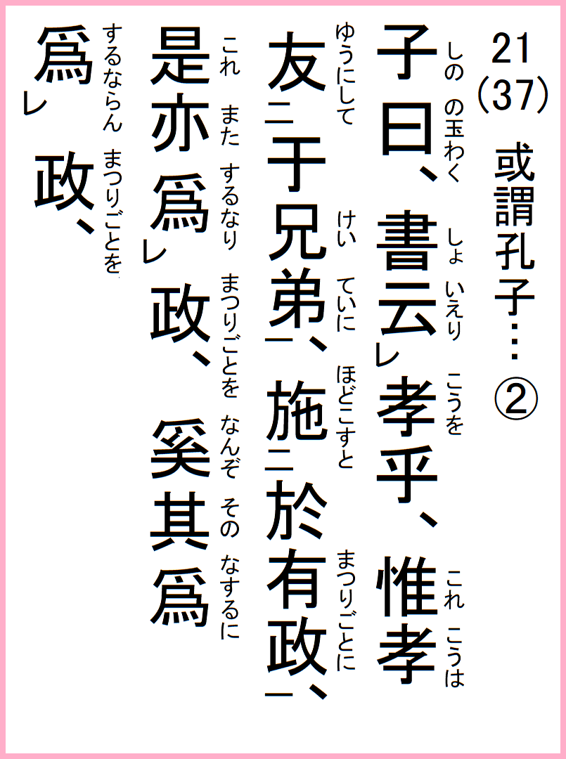 子の曰く、書孝を云えり、惟孝は兄弟に友にして、政に施すと、是れも亦政を為るなり、奚ぞ其の為するに政を為るならん、