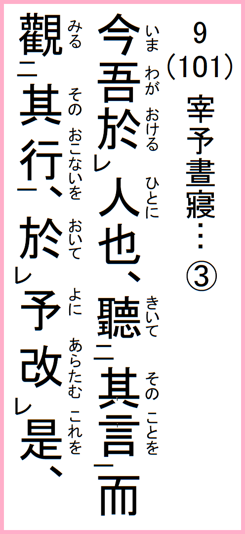 しかし今は、人と接するとき、その言葉を聞いてもそのまま信じず、その行動を観察することにした。宰予と接して、考えを改めることにした。