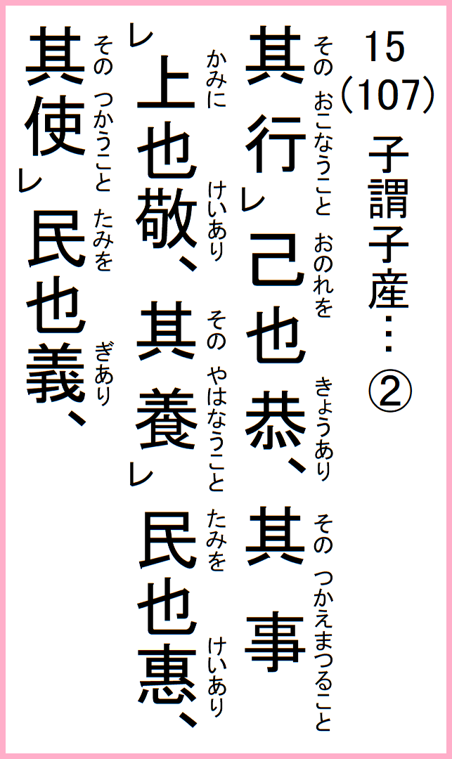 行いは恭しく謙ること、君親および自分より目上の人に事えるときは慎み怠らず敬うこと、民を養うときは民を愛し民を利益を大事にして、恩恵を深くすること、民を使うときは義のよろしきに敵うよう、必要最低限にすること。