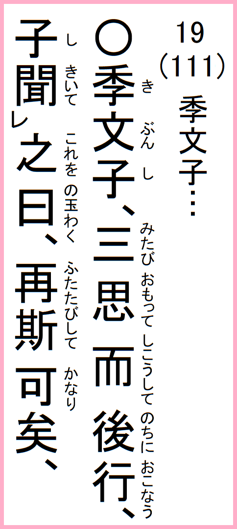 季文子、三思而後行、子聞之曰、再斯可矣、