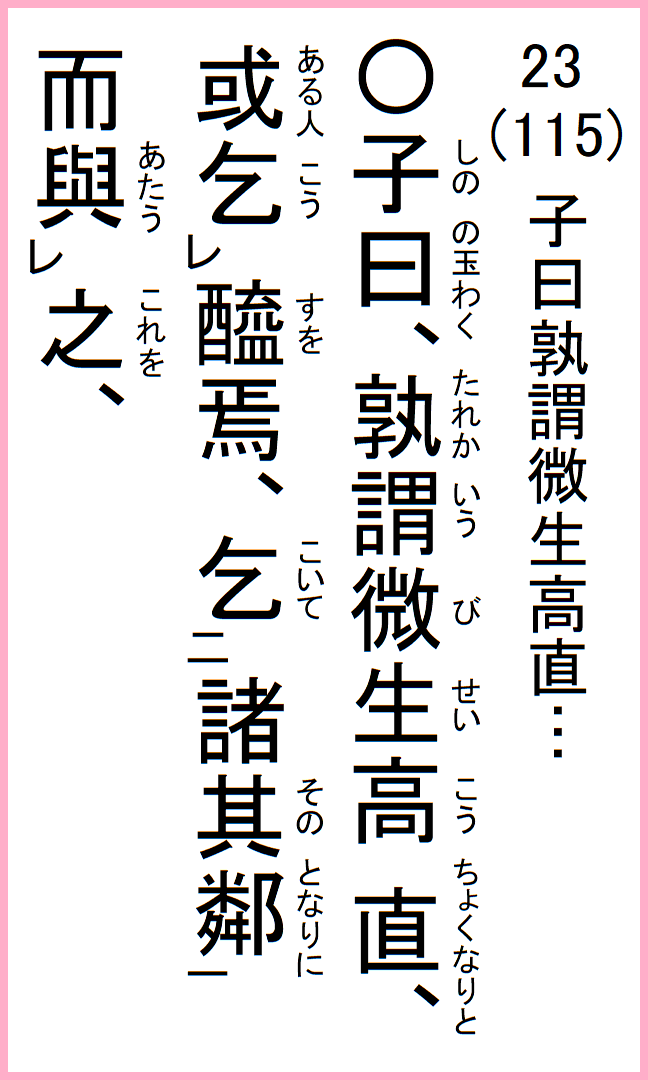 5-23 子曰、孰か謂う微生高直なりと、或る人酢を乞う…