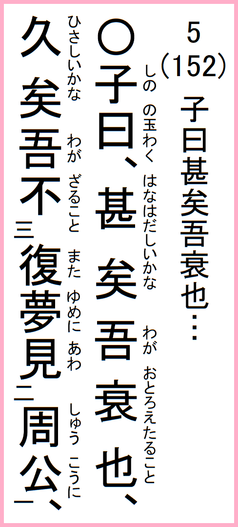 子の曰く、甚だしいかな吾が衰えたること、久しいかな、吾が復た夢に周公に見わざること、