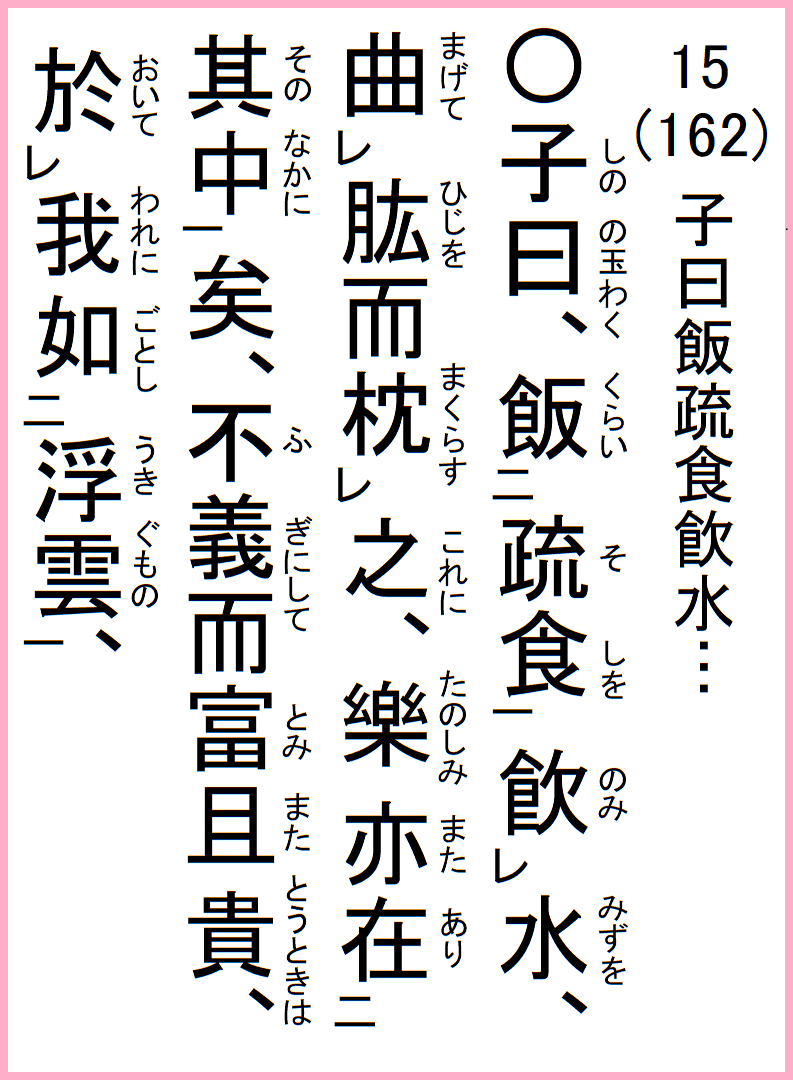 子の曰く、疏食を飯い、水を飲み、肘を曲げて之に枕す、楽しみ亦其の中に在り、不義にして富また貴きは、我に於いて浮雲の如し、