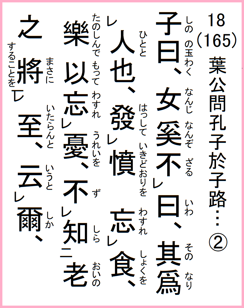 子の曰く、女、なんぞ曰ざる、其の人と為り、憤りを発して食を忘れ、楽しんで以って憂いを忘れ、老いの將に至らんとすることを知らず、爾か云うと、