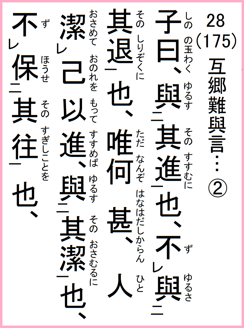 子曰、與其進也、不與其退也、唯何甚、人潔己以進、與其潔也、不保其往也、