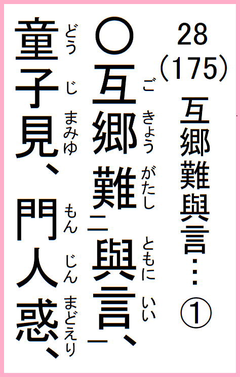 互郷という名の郷があった。その郷の人はみな不善を当然のこととしていたので、善を言い難い環境だった。ある時、その互郷の童子が来て、先生と会う機会を得た。諸弟子は先生がこの童子に会うことを訝しく疑った。