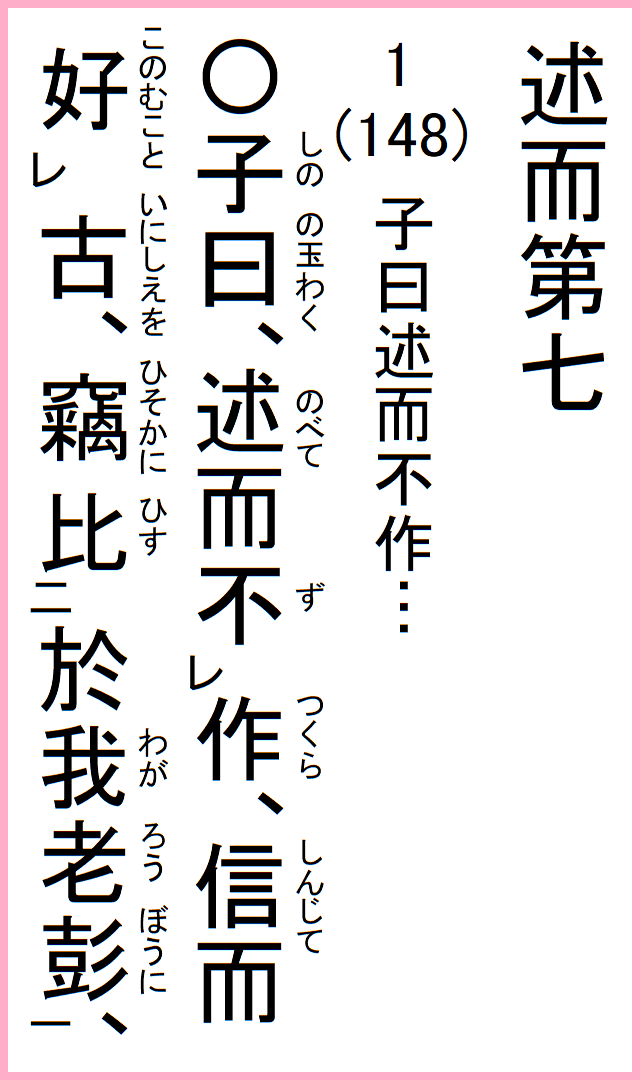 先生が仰った。いろいろな書物について述べたが、それらは自分が制作したものではない。古代の道を信じて篤く好んだ成果に過ぎない。その古代を好む思いについては、表立って言うことではないが、密かに商(殷)の賢大夫の老彭と比較すれば、おそらく同等だろうと考えている。