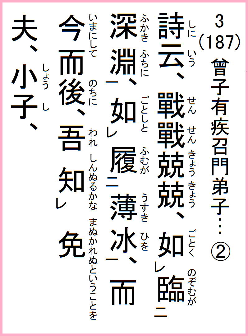 詩に云く、戦々兢々、深き淵に臨むが如く、薄き冰を履むが如し、今にして後に、吾免れぬということを知んぬるかな、小子、