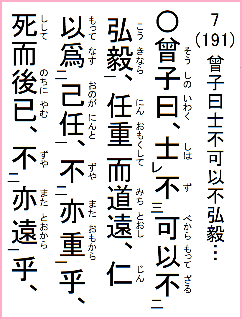 8-7 曽子曰、士、以って弘毅ならざるべからず、任重…