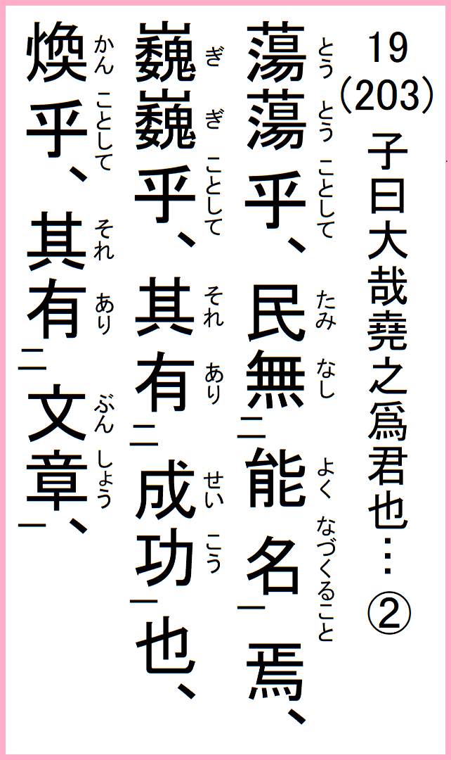 蕩蕩乎として、民、能く名づくること無し、巍巍乎として、其れ成功有り、煥乎として、其れ文章有り、