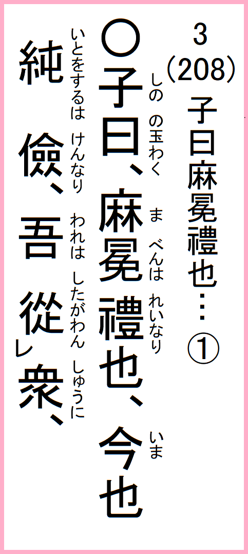 子の曰く、麻冕は礼なり、今、純をするは倹なり、吾は衆に従わん、