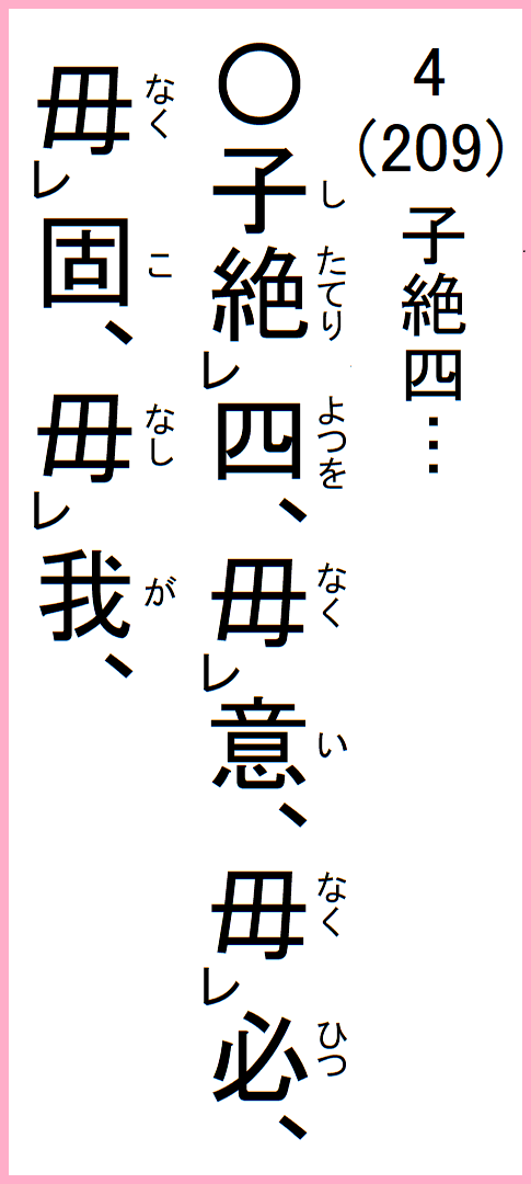 9-4 子、四つを絶てり、意毋く、必毋く、固毋く、我毋…