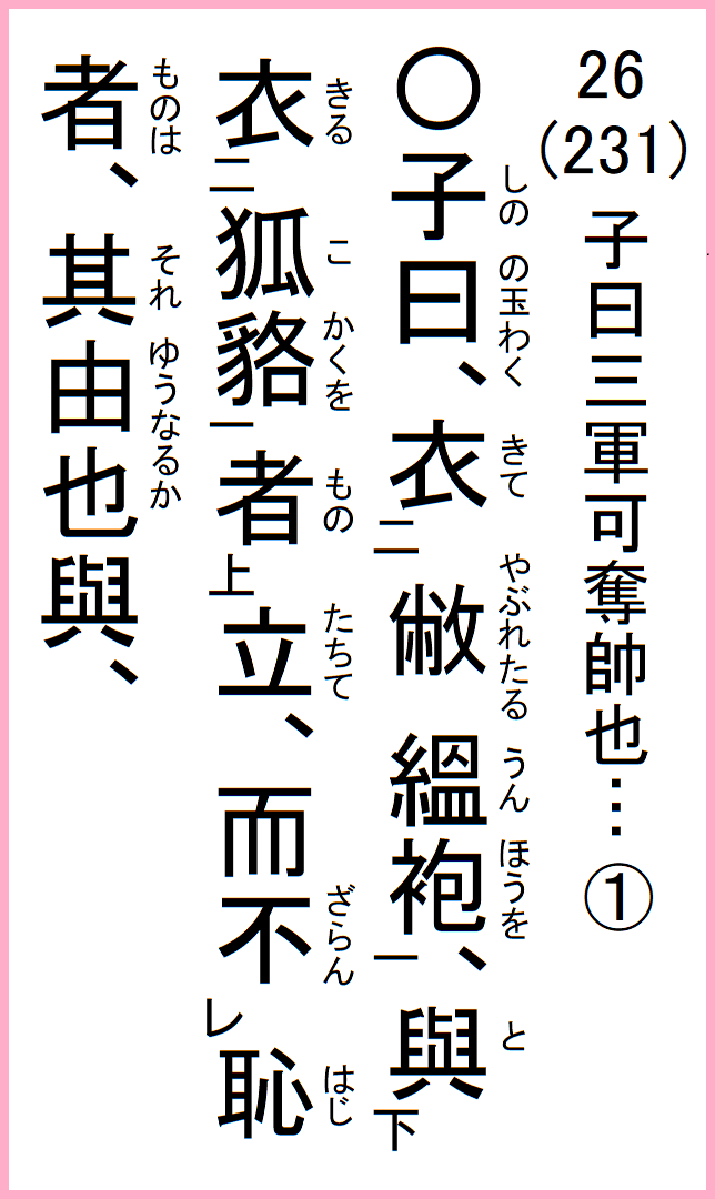 9-26 子曰、敝れたる縕袍を衣て、狐貉を衣る者と立ち…
