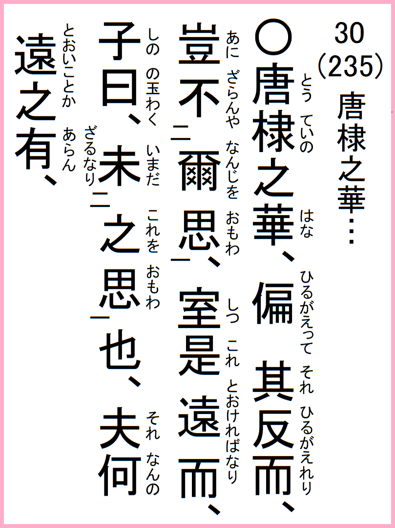 唐棣之華、偏其反而、豈不爾思、室是遠而、子曰、未之思也、夫何遠之有、