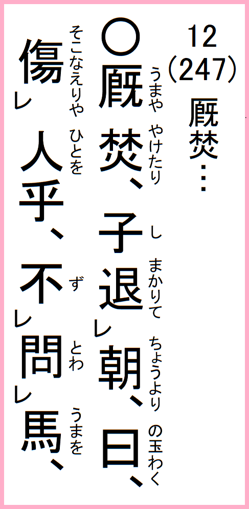 厩焚けたり、子、朝より退りて、曰く、人を傷えりや、馬を問わず、