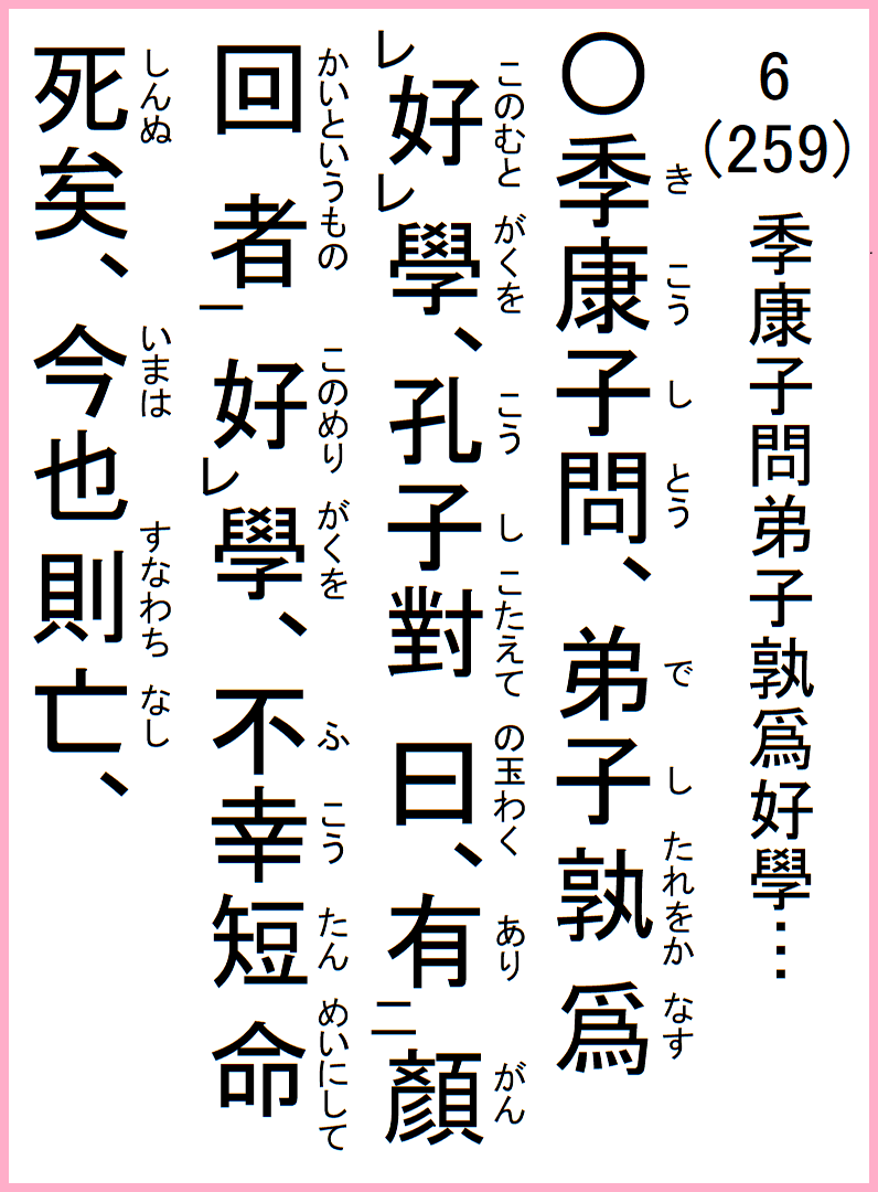 季康子問、弟子孰爲好學、孔子對曰、有顔回者好學、不幸短命死矣、今也則亡、