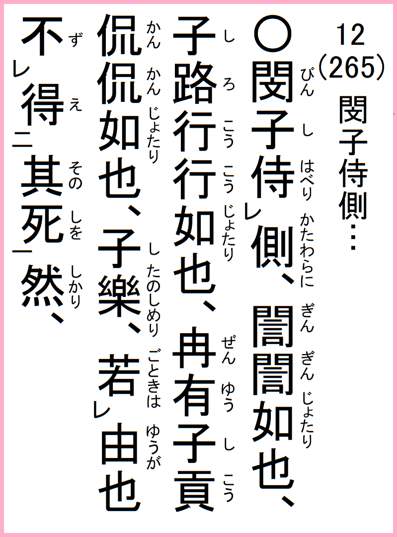 閔子側に侍り、ァァ如たり、子路、行行如たり、冉有、子貢、侃侃如たり、子楽しめり、由が若きは其の死を得ず、然り、