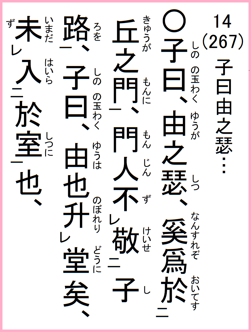 先生が仰った。由が瑟を弾いているが、なんで私の家に似つかわしくないそんな荒々しい曲を弾くのか。やがて弟子たちはそんな子路を尊敬しなくなった。そこで先生が仰った。由は、例えばすでに堂にのぼっているが、まだ室に入っていないだけだ。