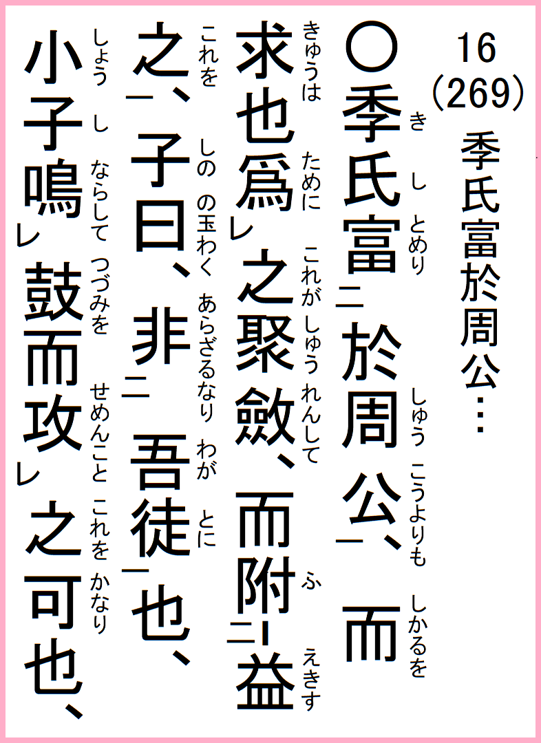 季氏、周公よりも富めり、而るを求は、之が為に聚斂して之を附益す、子の曰く、吾が徒に非ざるなり、小子鼓を鳴らして之を攻めんこと可なり、