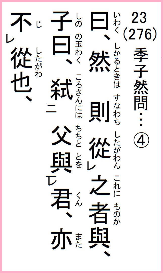 曰く、然るときは則ち之に従わん者か、子の曰く、父と君とを弑さんには、また従わじ、