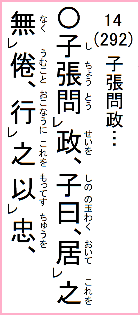 12-14 子張、政を問う、子曰、之を居いて倦むこと無…