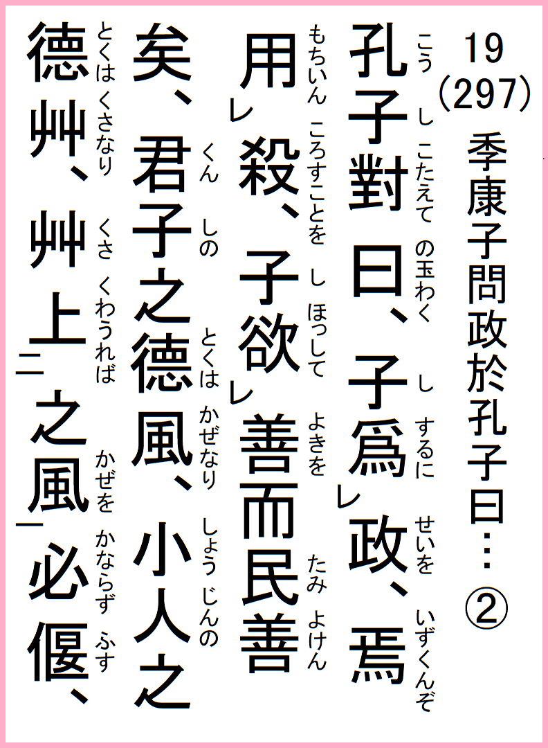 孔子、対えて曰く、子、政を為るに、焉んぞ殺すことを用いん、子、善きを欲して民善けん、君子の徳は風なり、小人の徳は艸なり、艸、風を上うれば必ず偃す、
