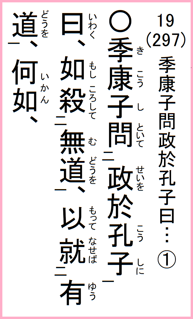 季康子が政について孔子に質問して言った。もしも、道を無視して悪しきことを行う者を殺し、道に順う者の思いを成就させるのはどうだろうか。