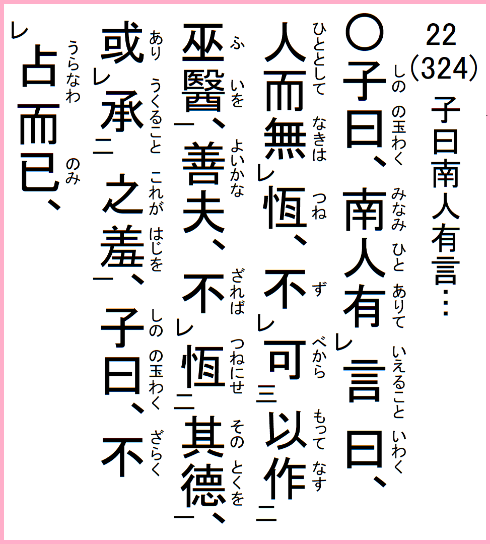 子曰、南人有言曰、人而無恆、不可以作巫醫、善夫、不恆其徳、或承之羞、子曰、不占而已、