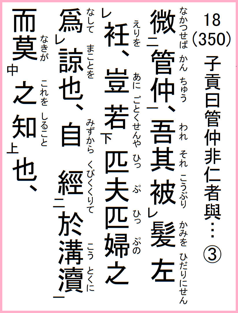 管仲微つせば、吾れ其れ髪を被り衽を左にせん、豈、匹夫匹婦の諒を為して、自ら溝涜に経りて之を知ること莫きが若くせんや、