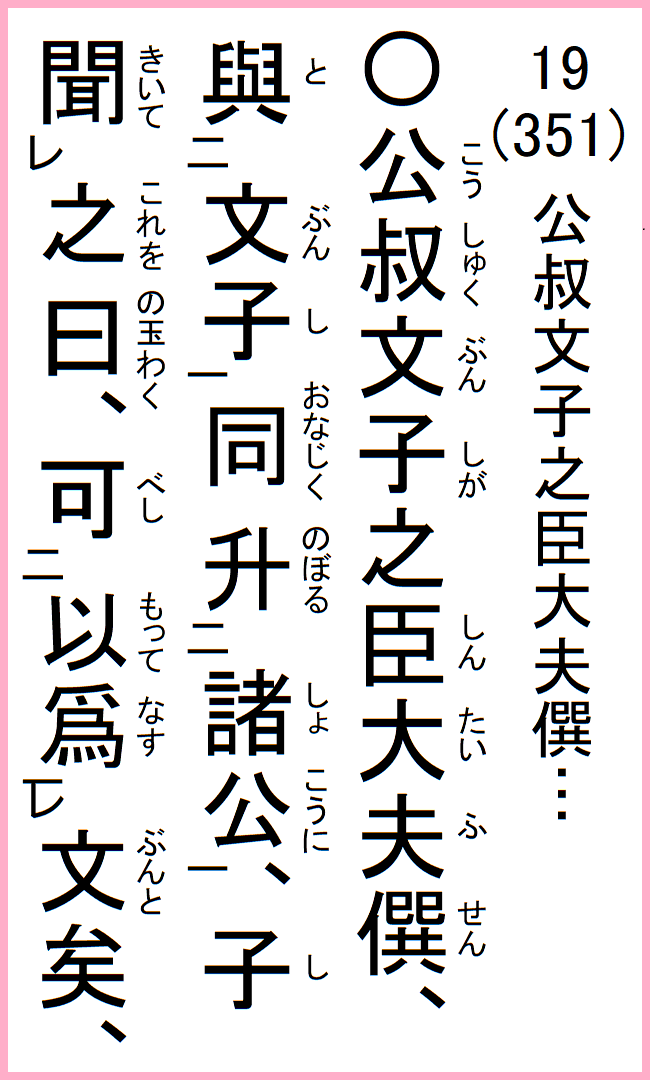 公叔文子が臣、大夫僎、文子と同じく諸侯に升る、子これを聞いて曰く、以って文と為す可し、