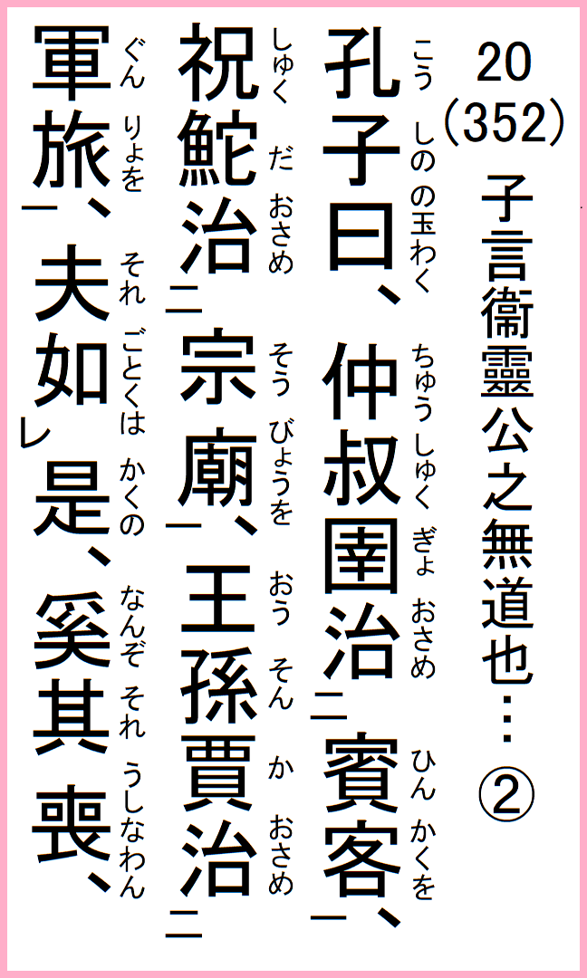 孔子の曰く、仲叔圉、賓客を治め、祝鮀、宗廟を治め、王孫賈、軍旅を治む、夫れ是の如くは、奚ぞ其れ喪わん、