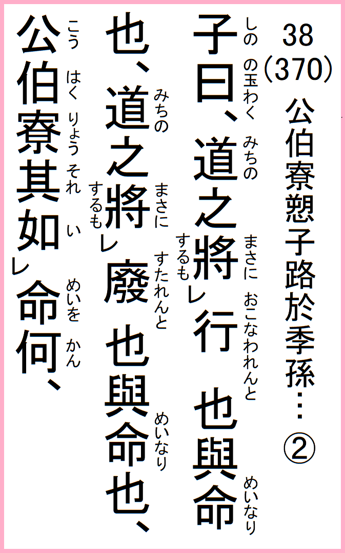 子曰、道之將行也與命也、道之將廢也與命也、公伯寮其如命何、