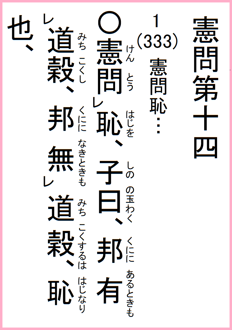 憲、恥を問う、子の曰く、邦に道有るときも穀し、邦に道無きときも穀するは、恥じなり、