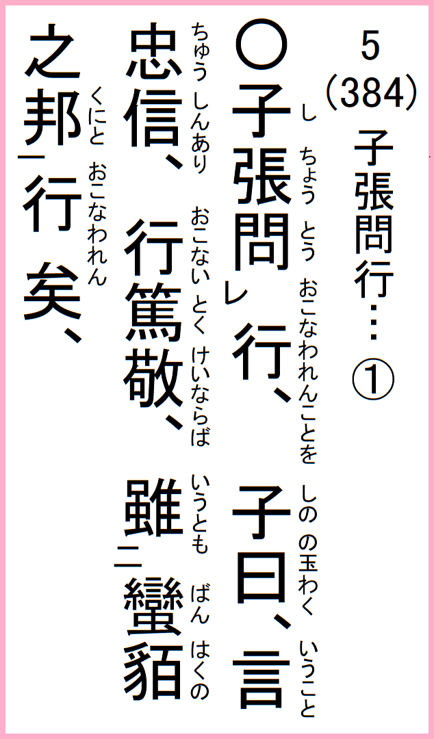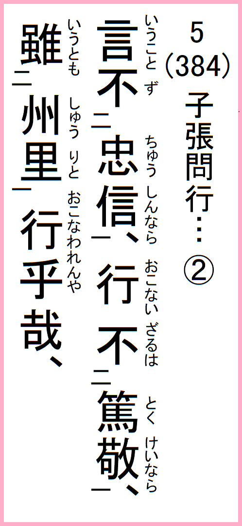 子張問行、子曰、言忠信、行篤敬、雖蠻貊之邦行矣、言不忠信、行不篤敬、雖州里行乎哉、