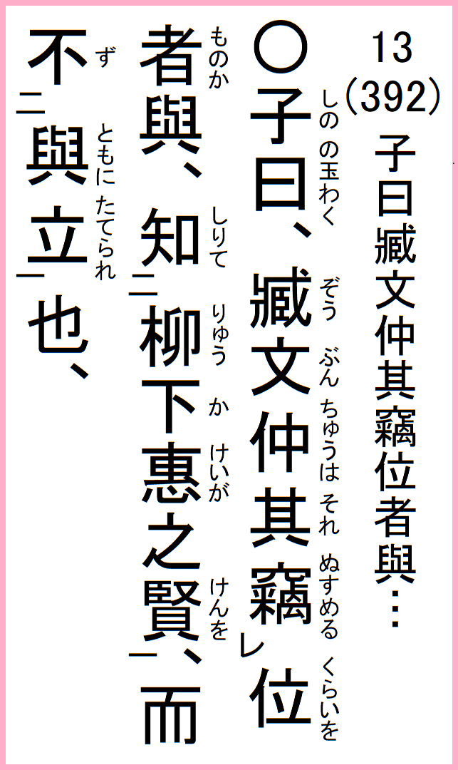 15-13 子曰、臧文仲は、其れ位を竊める者か、柳下惠…
