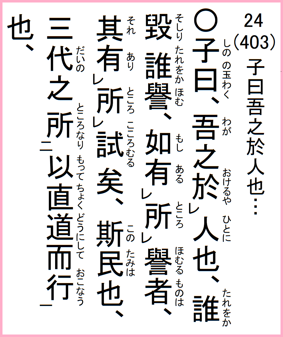 子の曰く、吾が人に於けるや、誰をか毀り誰をか誉む、如し誉むる所有る者は、其れ試みる所有り、斯の民は、三代の以って直道にして行う所なり、