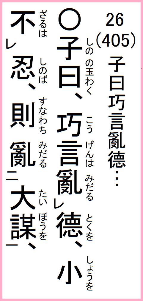 15-26 子曰、巧言は徳を乱る、小を忍ばざるは、則ち…