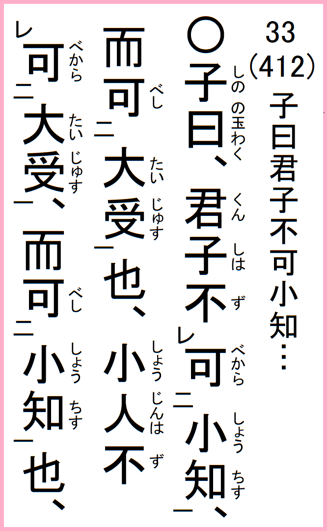 子の曰く、君子は小知す可からず、大受す可し、小人は大受す可からず、小知す可し、