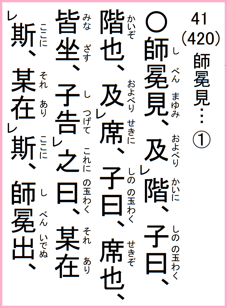 15-41 師冕見ゆ、階に及べり、子曰、階ぞ、席に及べり…