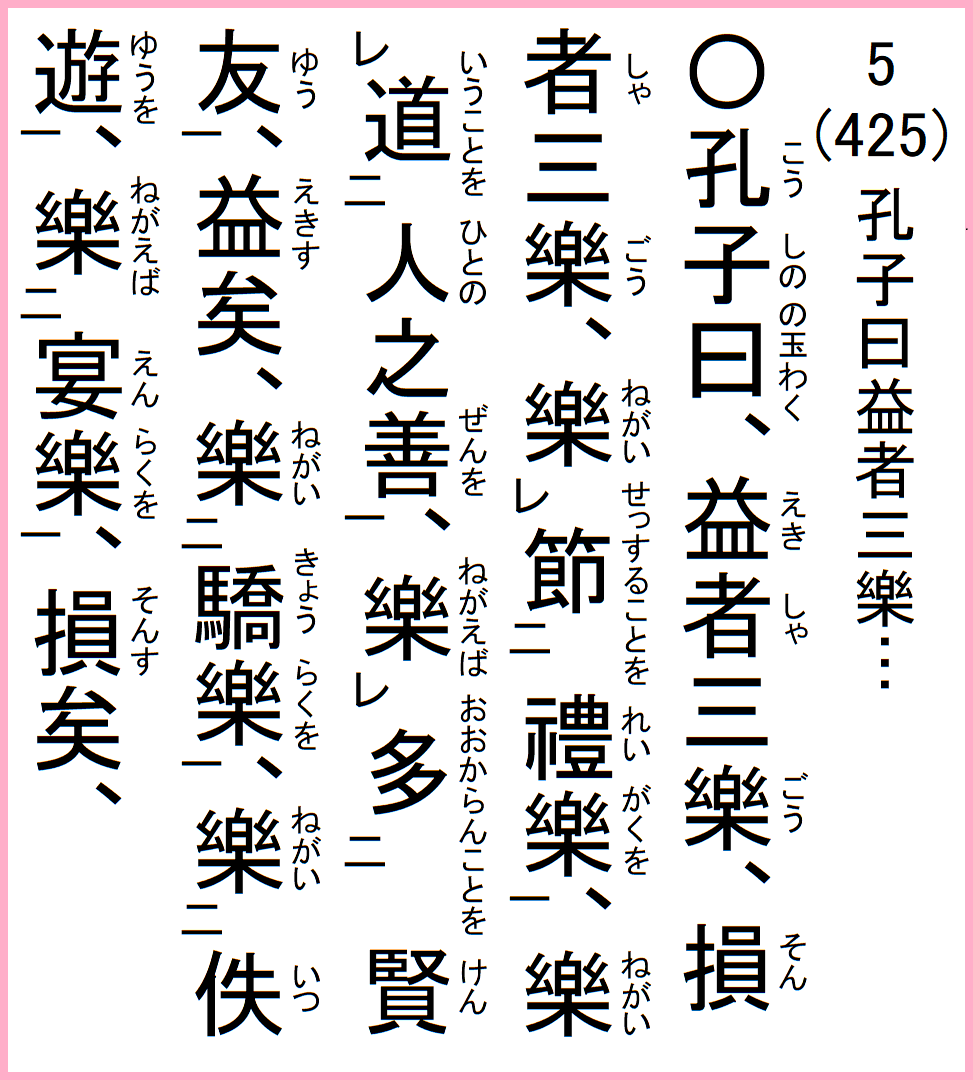 孔子曰、益者三樂、損者三樂、樂節禮樂、樂道人之善、樂多賢友、益矣、樂驕樂、樂佚遊、樂宴樂、損矣、