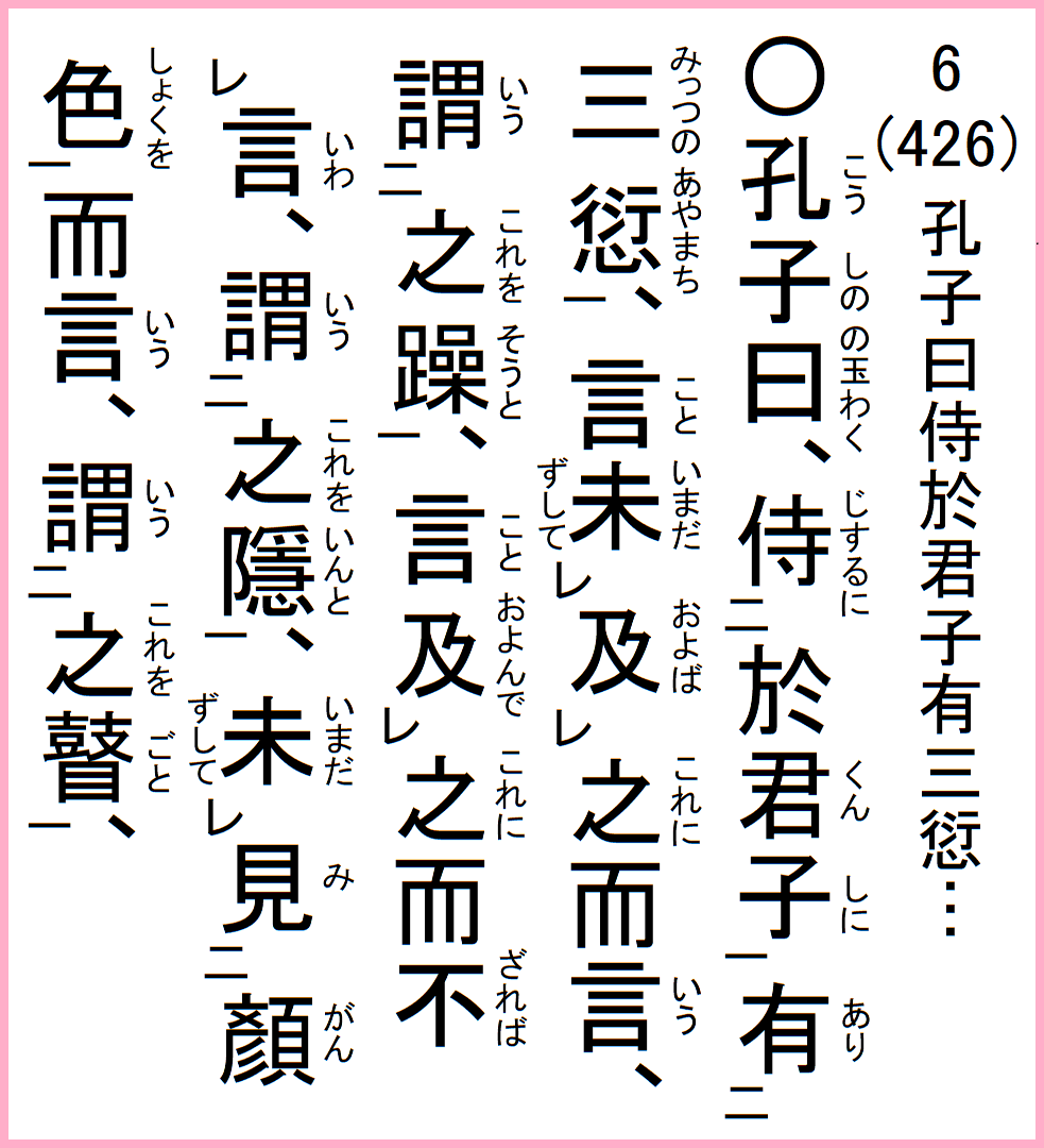 孔子の曰く、君子に侍するに三つの愆ち有り、言、未だ之に及ばずして言う、之を躁と謂う、言、之に及んで言わざれば、之を隠と謂う、未だ顔色を見ずして言う、之を瞽と謂う、