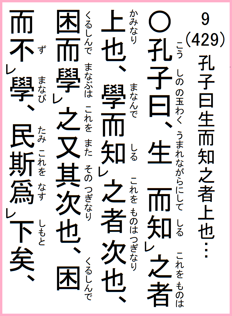 孔子の曰く、生まれながらにして之を知る者は、上なり、学んで之を知る者は、次なり、困んで之を学ぶは、また其の次なり、困んで学びず、民斯れを下と為す、