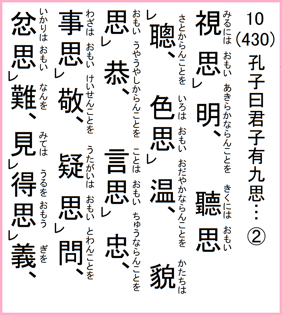 視思明、聽思聰、色思温、貌思恭、言思忠、事思敬、疑思問、忿思難、見得思義、