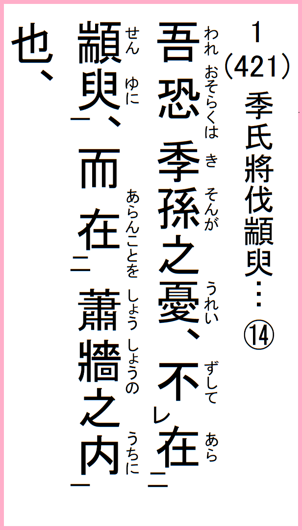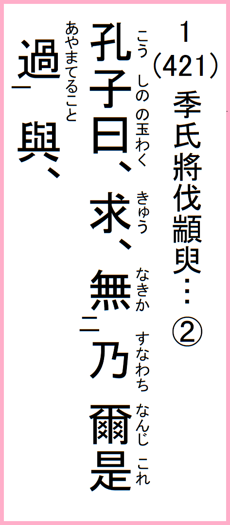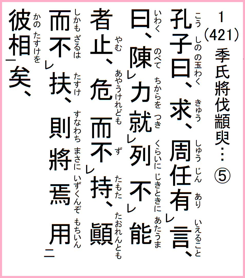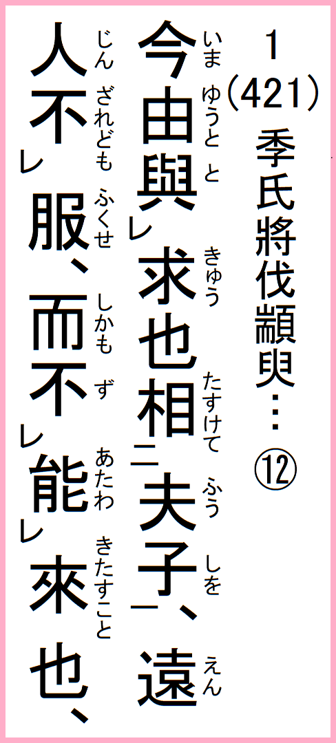 季氏、将に顓臾を伐たんとす、冉有季路、孔子に見えて曰く、季氏、将に顓臾に事有らんとす、