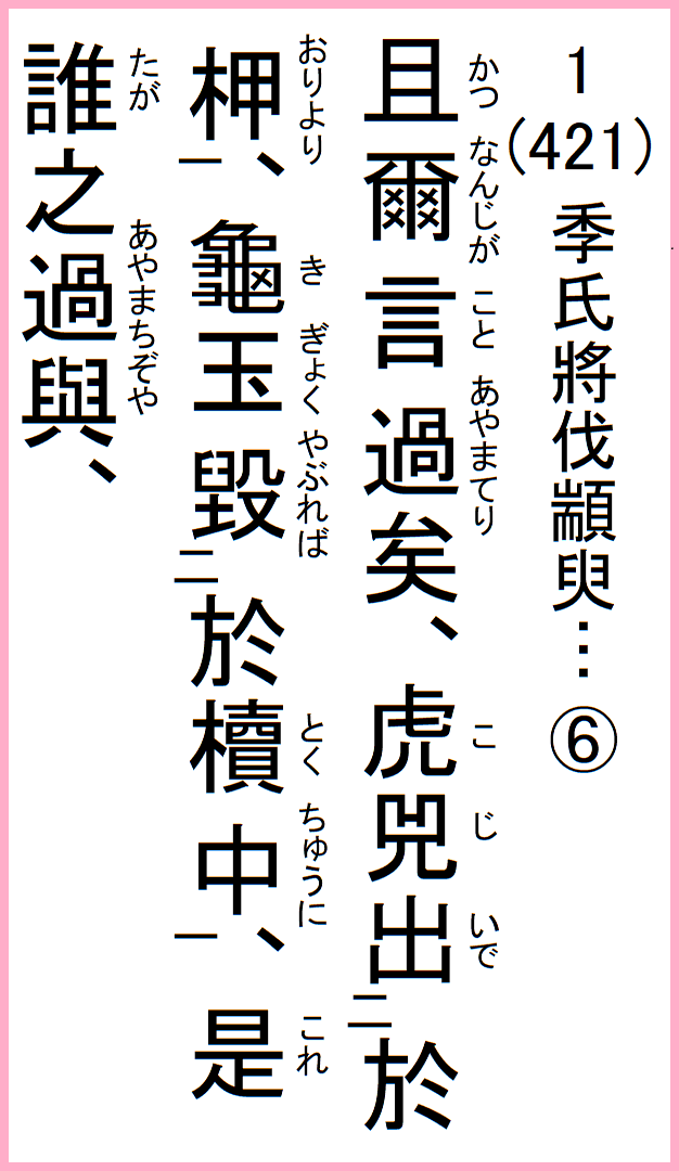 且、爾が言、過てり、虎兕、柙より出で、亀玉、櫝中に毀れば、是れ誰か過ちぞや、