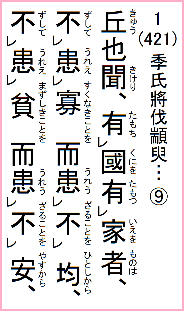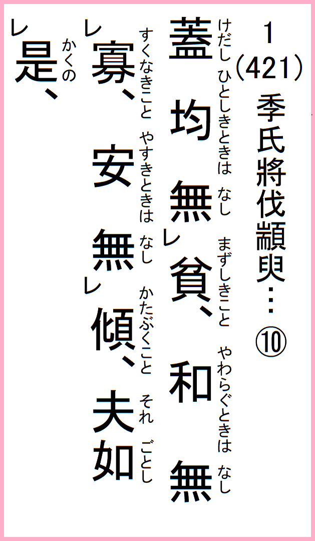 丘、聞けり、国を有ち家を有つ者は、寡きことを患えずして、均しからざることを患う、貧しきことを患えずして、安からざることを患う、