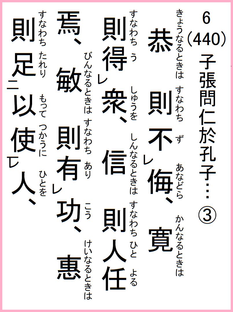 恭しければ何事も侮らない。寛としたゆたかな心があれば衆を受け入れて失わない。信があれば人は頼み任せて疑わない。敏として何事も怠らなければ事成りて功が有る。恵があれば人は懐いてこれを使い用いるのに足りる。